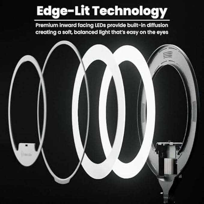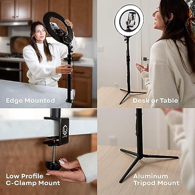 ENHANCE YOUR APPEARANCE: Elevate your live streams, selfies, videos, and calls to the next level with our adjustable ring light kit. Designed for travel, our 12-inch ring light offers the perfect lighting to capture intriguing shots and videos wherever you go, ensuring you always look your best. ADJUSTABLE LIGHT SETTINGS: Effortlessly customize your lighting experience with the built-in Smart LED Screen, allowing easy adjustments to brightness and color temperature. This unique camera ring light includes a tilted mount knob, enabling angle adjustments of up to 180º for versatile and precise lighting control. PERFECTLY SIZED: Whether you are at home or traveling abroad, this ring light has a 12” diameter and extends from 16” to 40” with the flexible stand. Use the extendable stand with the firm tripod on a flat surface or use the edge clamp for sturdy, steady lighting on any edged surface. EDGE-LIT LED TECHNOLOGY: Experience both natural and soft lighting when using our mini ring light. The light is built with advanced inward-facing technology to ensure perfect and proper lighting in any location. ENJOY CONTINUOUS LIGHTING: Each light stand includes a plug-in cord that provides continuous power. USB-C & USB-A charging ports are also built into the arm of the light for convenient power sources.