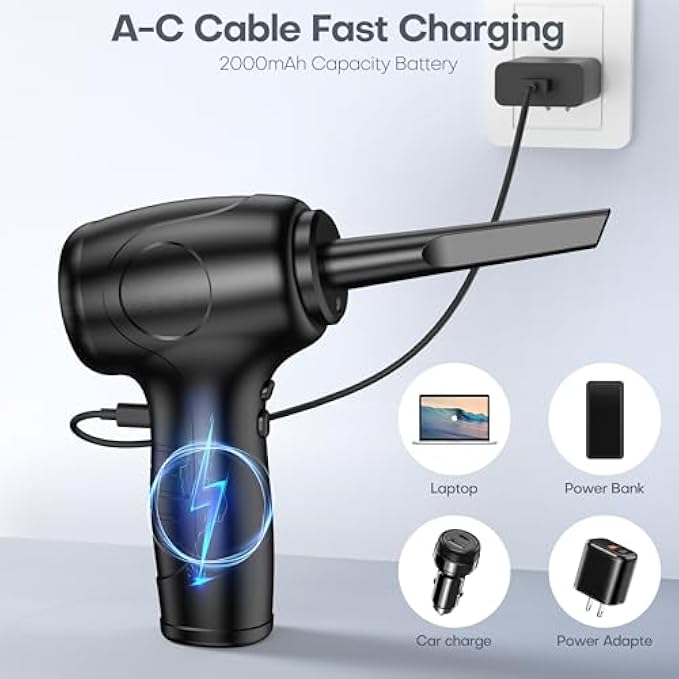 • Air Duster Electric: Our air duster for PC is a mini, portable and cordless device that uses air pressure for cleaning, providing a hassle-free solution to keep your electronic devices dust-free.