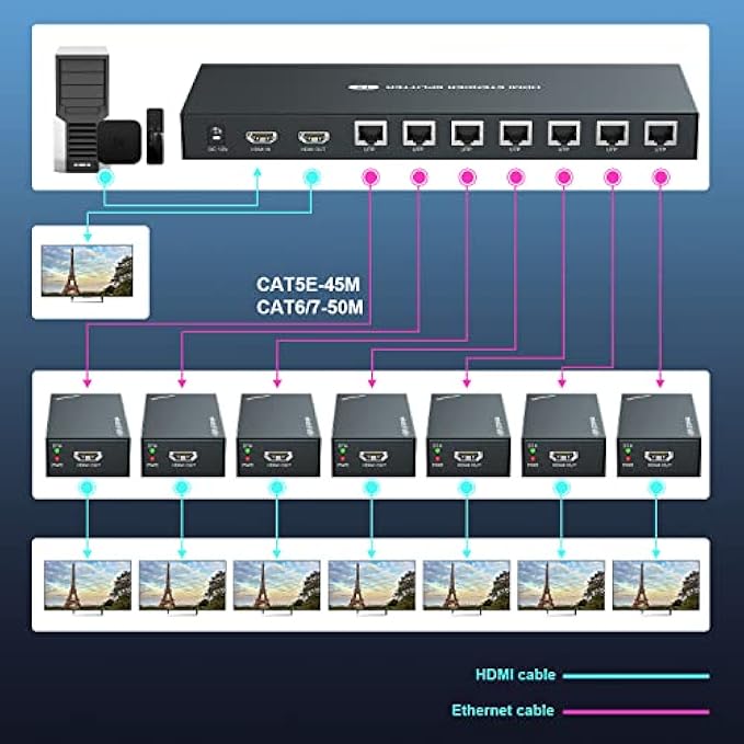 【 One Transmitter + 7 Receivers 】 Split audio and video into 7 channels of the same signal for long distance transmission. In addition, with HDMI local output on the transmitter side, can connect the monitor locally. 【 Full HD 1080P 】 Up to 1920x1080P@60Hz, high-definition picture, clearer and more eye-catching. Also compatible with 3D signals and other 1080i/720p resolutions. 【 HDMI Over Ethernet 】 Up to 50m/164ft by Cat6/7, 45m/147ft by Cat5e, 40m/131ft by Cat5. High-quality cables are essential for stable signals and long-distance transmission. 【 Simpler Connection 】 Power over cable, only one power adapter is needed to get the device running completely. No more plugs needed. 【 Application 】 Mainly used in engineering, security, exhibitions, home audio&video, etc.