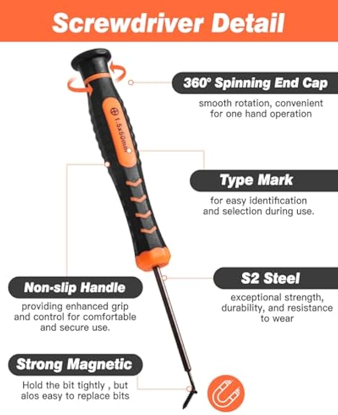 • Ergonomic design: The non-slip handles are made of PPR and PP material; with a flexible cap at the bottom of handles and a middle hole on the T6/T8/T10 Xbox screwdriver head, it is easier to repair kinds of electronics with better force transmission