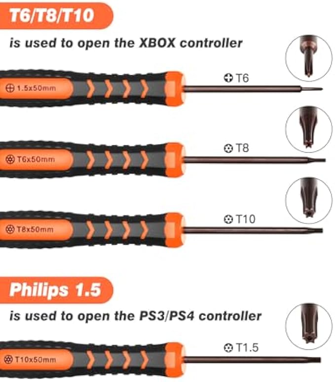 • Torx T6, T8 and T10 screwdrivers are suitable for Xbox 360 Xbox one controller,Cross screwdriver 1.5 for PS3 PS4 controller and many common electronics
