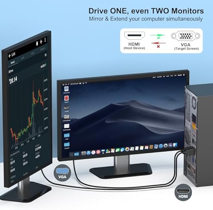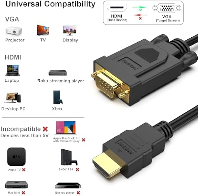 COMPACT DESIGN - The compact-designed portable Benfei HDMI to VGA adapter connects a computer, desktop, laptop, or other devices with HDMI port to a monitor, projector, HDTV, or other devices with VGA port; Tuck this lightweight gadget into your bag to do a business presentation with your laptop and projector, or extend your desktop screen to a monitor or TV; SUPERIOR STABILITY - Built-in advanced IC chip converts HDMI digital signal to VGA analog signal; ✅ It is NOT a bi-directional converter and cannot transmit signals from VGA to HDMI INCREDIBLE PERFORMANCE - The HDMI male to VGA Male cable supports resolutions up to 1920x1080@60Hz (1080p Full HD) including 720p, 1600x1200, 1280x1024 for high definition monitors or projectors; Gold plated HDMI connector resists corrosion and abrasion and improve the signal transmission performance; Molded strain relief increases cable durability BROAD COMPATIBILITY - The HDMI-VGA adapter is compatible with computer, pc, desktop, laptop, ultrabook, notebook, Chromebook, Raspberry Pi, Intel Nuc, Roku, PS3, Xbox One, Xbox 360, Wii U, Set Top Box, TV BOX, or other devices with HDMI port; ✅ NOT compatible with Blu-ray player and devices with low-power HDMI ports such as SONY PS4, Apple MacBook Pro with Retina Display, Mac mini, and Apple TV; 18 MONTH WARRANTY - Exclusive Benfei Unconditional 18-month Warranty ensures long-time satisfaction of your purchase; Friendly and easy-to-reach customer service to solve your problems timely