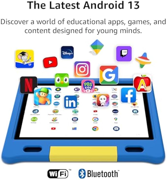 • Content kids love+Educational apps Installed: This children’s tablet is designed for toddlers and offers support for multiple languages, including Spanish. It comes with a variety of free educational and entertainment apps such as Netflix, Disney Plus, ABC Mouse, YouTube Kids, Amazon Prime Video, Xfinity Stream, and more. It is an excellent device for children to learn and play