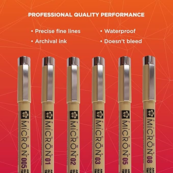 Precise archival pens create fade resistant, waterproof, bleed free marks for drawing, artwork, journaling, and more Includes 6 black ink Pigma Micron pens in point sizes 005 (0.20mm), 01 (0.25mm), 02 (0.30mm), 03 (0.35mm), 05 (0.45mm), and 08 (0.50mm) Pigma Micron ink is pH neutral, quick drying, and approved by ACMI toxicologists; pens have AP certification seal Single pigment ink prevents color variations; pens feature durable plastic body and smooth grip for comfort Japanese quality Sakura Pigma Micron pens deliver consistent results for manga artists, graphic designers, and crafters