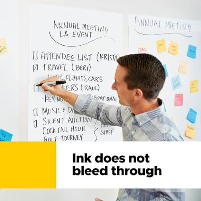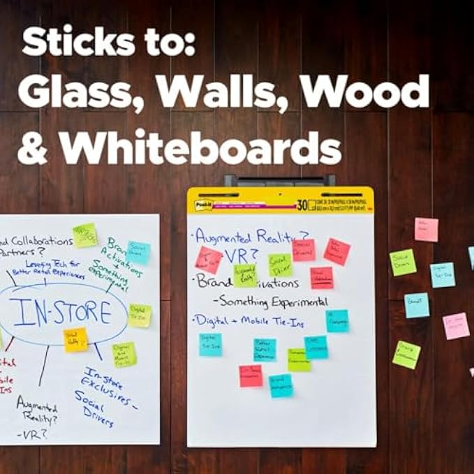 STICKS SECURELY AND HOLDS UP TO 2X LONGER - Easel paper can be repositioned without surface damage. No tape or tacks needed unlike standard flip chart paper. Keep agenda and ideas where everyone can see INK BLEED-THROUGH RESISTANT PAPER - Large white premium self-stick flip chart paper that resists marker bleed-through to keep great ideas on the page, not on what's under the page IDEAL FOR BRAINSTORMING AND MANAGING PROJECTS - Perfect for training or teaching sessions, brainstorming sessions, planning sessions, project management and agile processes, meetings and presentations DOWNLOAD THE FREE POST-IT APP - Whether you’re working or learning remotely, the Post-it App is the perfect way to capture and share ideas, keep track of assignments, or create colorful calendars with your friends. Share across multiple platforms including Dropbox, Trello, PowerPoint, or synced across your devices DESIGNED TO FIT MANY EASEL STANDS - Sturdy backcard has a handle to make the easel pad portable and slots to fit most easel stands. Perfect for student activities and training sessions USE WITH POST-IT SUPER STICKY NOTES - The large, stickable paper to capture thoughts with Post-it Super Sticky Notes. Give ideas a place to grow EXPLORE OPTIONS - Post-it Super Sticky Easel Pads are also available with Grid Lines, Lines, Dot, Bright Yellow, and White Recycled Paper EXPLORE SIZES - Post-it Super Sticky Easel Pads also available in more sizes - Mini Easel Pad, Tabletop Pad and Wall Pad USA - Made in the USA with globally sourced materials Self-stick sheets stick firmly without damage to most walls; no need for tacks, tape or other fasteners Perfect for training sessions, brainstorming sessions, meetings and presentations, this sticky self-stick easel pad has premium paper