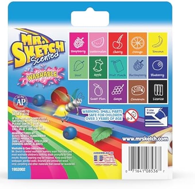 • Unleash your child’s imagination into a world of cinnamon scented giraffes and orange coated airplanes with Mr. Sketch Scented Washable Markers. The captivating aromas and vibrant colors are sure to inspire creativity. The scented markers feature a thick barrel that’s easy for kids to grip and a versatile chisel tip that delivers three line widths.
