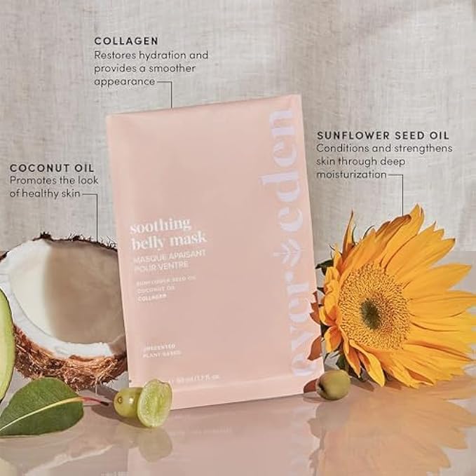 HYDRATE & NOURISH YOUR GROWING BELLY SKIN: Treat yourself to the ultimate moment of self-care with the nourishing botanicals in our maternity skin care belly mask! SOOTHE ITCHING & IRRITATION: Put your pregnancy belly mask on and calm belly itch thanks to the soothing ingredients in our pregnancy first trimester must haves. COMBAT THE POTENTIAL APPEARANCE OF STRETCH MARKS: Combining clean collagen, clean oils and various botanical extracts, each belly mask for stretch marks helps support your belly in transition. SAFE FOR ALL MOTHERS: Made to highest quality standards in the USA, our pregnancy care products are dermatologist-tested & formulated to be safe for sensitive skin and pregnant or breastfeeding people. CLEAN & VEGAN INGREDIENTS: Our maternity essentials for pregnancy are made with clean ingredients and developed by dermatological experts. No sulfates, parabens, phthalates, or petrolatum.