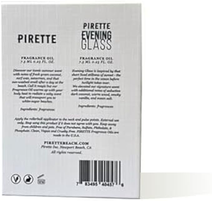 PIRETTE Mini Duo Set Evening Glass + Pirette Fragrance, Travel Size Perfume Oil, Warm Wood, Smoky Vanilla, Fresh Coconut, Surf Wax & Sunscreen, 0.25 Fl Oz (Pack of 2)
