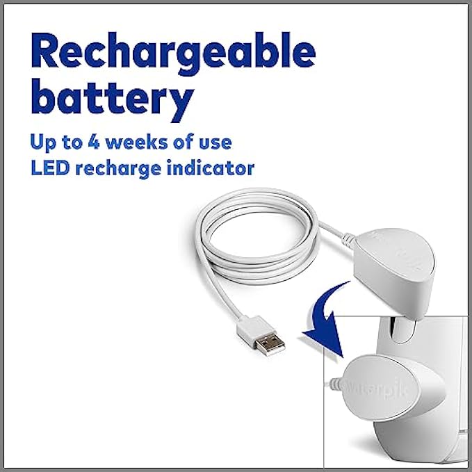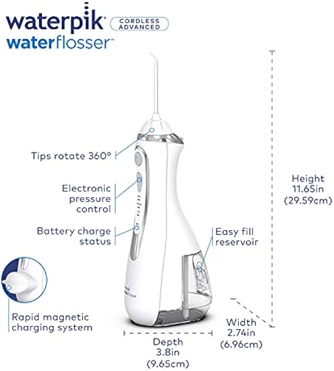ADVANCED CORDLESS WATER FLOSSER: Waterpik Cordless Advanced features a 360 degree rotating tip for easy reach, even back teeth. Convenient rechargeable design with up to 4 weeks of use per charge, rapid magnetic USB charger, and LED recharge indicator. GREAT FOR TRAVEL: The Cordless Advanced water flosser is portable and global voltage compatible; it includes a micro-fiber travel bag, tip storage case, and water plug for travel and use on the go. DENTIST RECOMMENDED: Waterpik is the #1 water flosser brand recommended by dental professionals and the only water flosser brand to earn the American Dental Association (ADA) Seal of Acceptance for safety and effectiveness. KEY FEATURES: 4 tips, 3 safe and effective pressure settings, 7oz removable reservoir (top-rack dishwasher safe), up to 45 secs floss time, recharge indicator, USB magnetic charger (wall adapter not included), 360 tip rotation, waterproof for shower use. PROVEN EFFECTIVE: Waterpik water flossers use PrecisionPulse technology to deliver a combination of water pressure and pulsations, removing up to 99.9 percent of plaque bacteria from treated areas that cause gingivitis, cavities, and bad breath. WARRANTY AND SUPPORT: Backed by a 2-year limited manufacturer’s warranty, see manual for details. Waterpik’s Colorado support team is available to help with any product questions or needs.