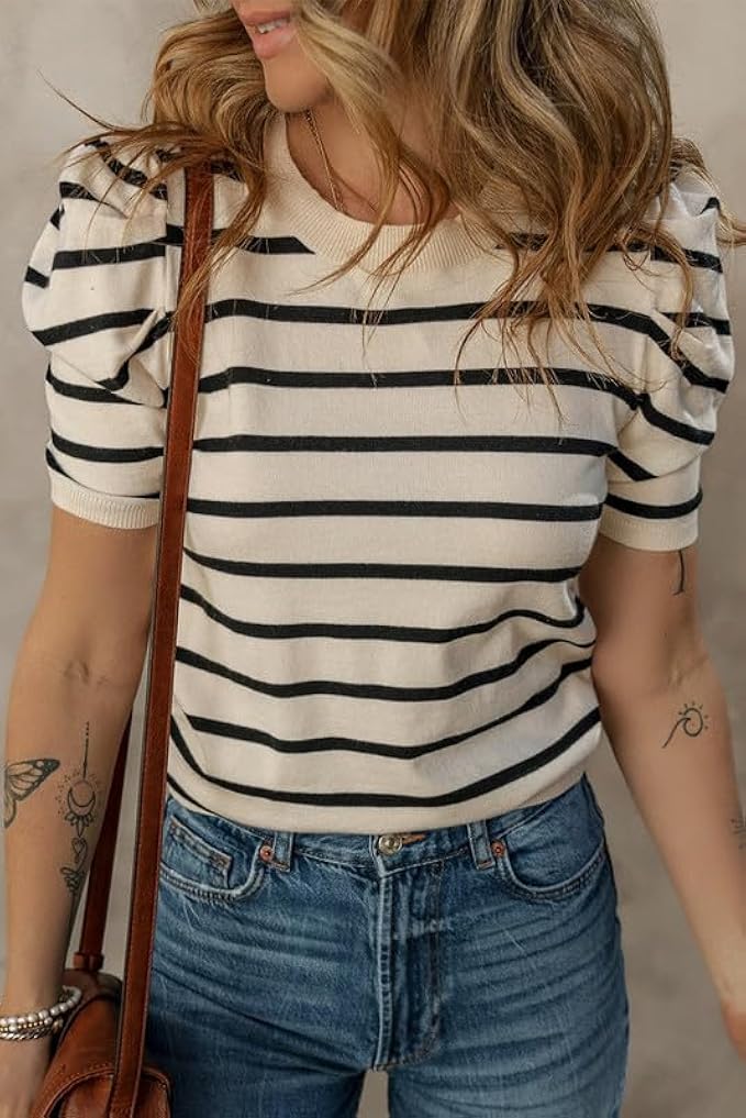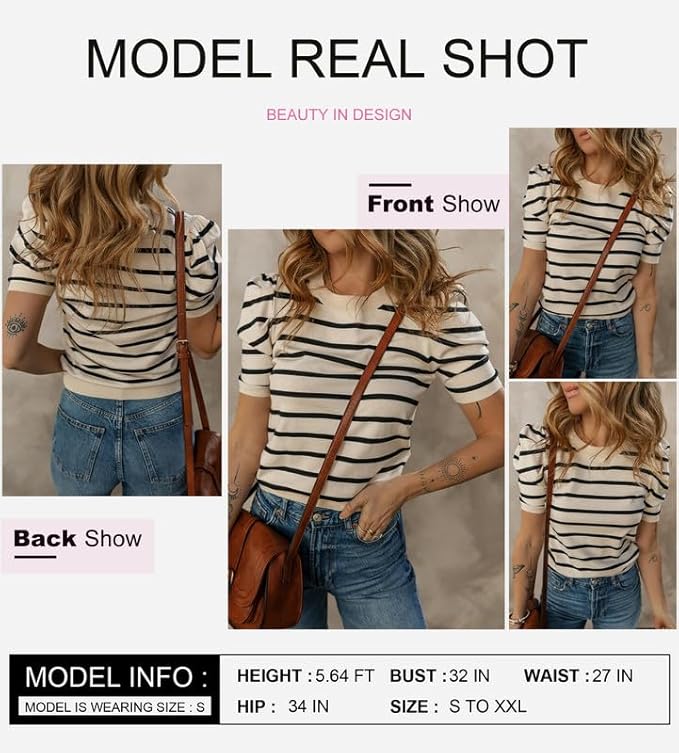 • Unique Design: Stylish Striped Pattern,Comfortable Crewneck Design and Unique Short Puff Sleeve Shape Bring you Youthful Vitality and Fashion Sense. At the Same Time, the Texture of the Knitted Fabric Also Makes this Puff-Sleeved Knit Tops an Ideal Clothing Choice.