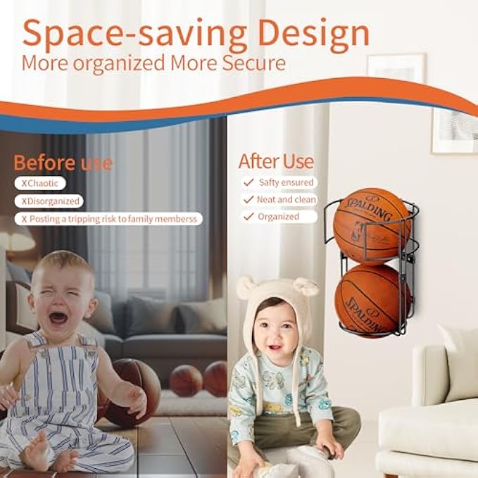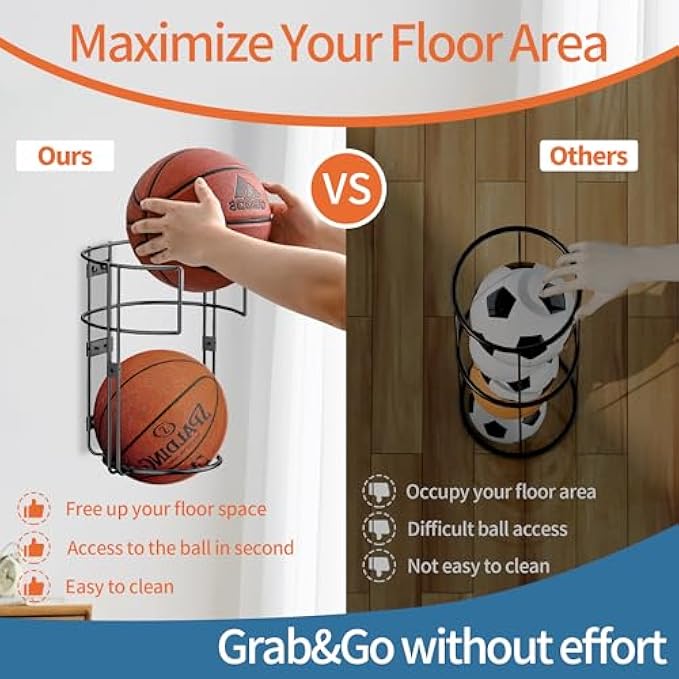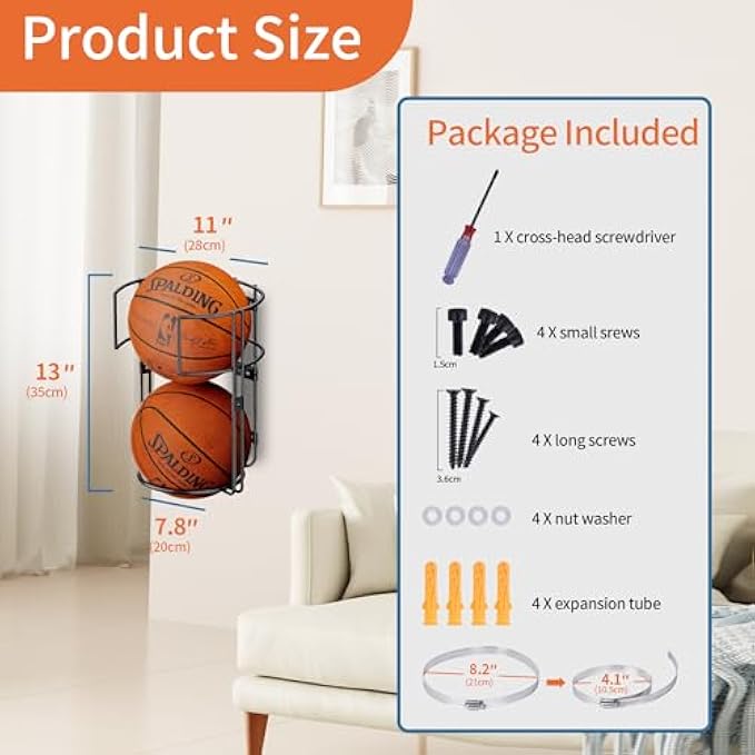 【A Versatile Solution for Sports Enthusiasts】 This dual-ball basketball holder is designed to accommodate 2 balls at once, ideal for basketballs, soccer balls, footballs, volleyballs, and kick balls with ease. Suitable for installation in a variety of settings such as your warehouse, bedroom, living room, garage or even an outdoor garden or yard, it ensures effortless accessibility whenever you're ready to play. 【Space-saving Ingenuity】Our compact basketball storage rack takes up minimal space, boasting a wall-mounted design that maximizes floor area. By elevating the clutter off the ground, it instantly creates more room for organization and adds to the overall tidiness and cleanliness of your home interior. 【Built to Last with Premium Quality】 Crafted from sturdy metal, this top-notch basketball holders for balls boasts superior durability and resistance against deformation and rust. Its weatherproof construction allows it to be used both indoors and outdoors without fear of degradation over time, ensuring a long-lasting service life. 【Two Installation Options for Convenience】Either affix it securely to the wall using the provided screws-in mounting hardware, or use the included metal hoop to hang it effortlessly on a pre-existing pope or bar. Both methods ensure stability and safety without demanding excessive effort.Have a try of this outdoor ball storage. 【Customer Satisfaction Guaranteed】 We pride ourselves on our commitment to customer happiness. Should there be any issues with outdoor ball storage, please feel free to reach out to us anytime for a prompt replacement or refund. Your satisfaction is paramount, and we appreciate your understanding. ❤Embracing the joy of movement for a healthier lifestyle, may this practical yet stylish ball holder solution enhance your everyday routine. Stay active, stay happy! Reminder:The cross-head screwdriveris only suitable for the installation screws of the black basketball rack frame.