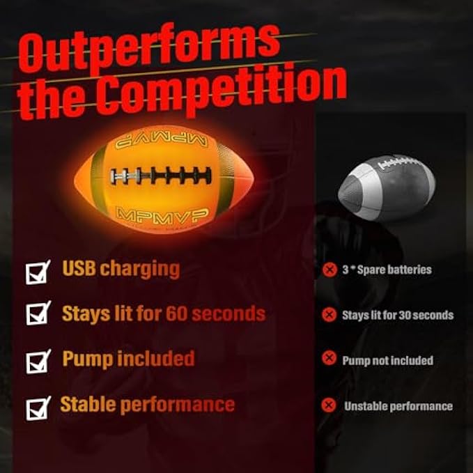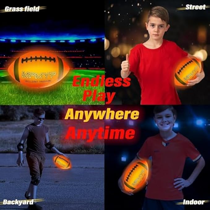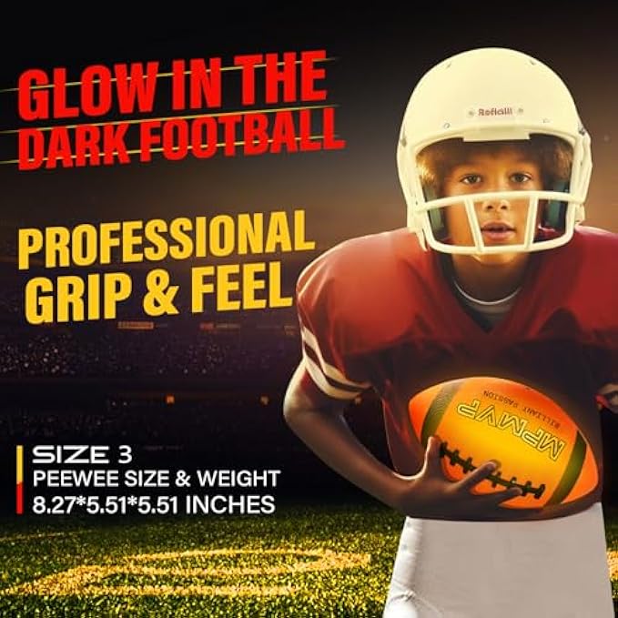 • Glow in the Dark Football: Cadyaw light up football offers you the professional feel of an official size 9 football, crafted with the perfect weight for champions, making every catch and throw full of vitality, elevating your game to a new level. Equipped with an intelligent reset mechanism, it stays lit during play, offering a new way to enjoy the game even on the darkest nights after the sun goes down.