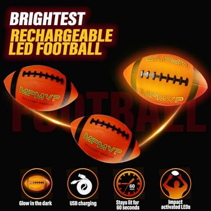 • Rechargeable & Bright: Cadyaw rechargeable lighted football only needs a 30-minute charge for long-lasting use, ensuring precious moments of American football fun with family and friends. Cadyaw led football is equipped with impact-activated LEDs that stay lit for at least 60 seconds once activated. They guarantee maximum visibility in the dark and automatically shut off after the game.