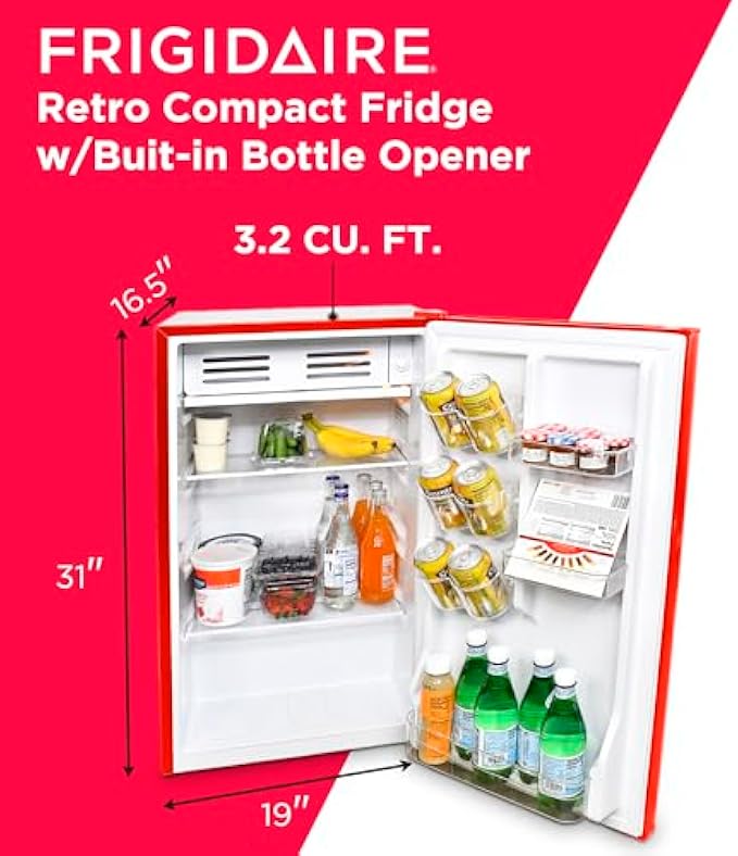 Frigidaire Retro Compact Fridge with Chiller, 3.2 cu ft Countertop Fridge with Built-In Bottle Opener, Compact Refrigerator for Office, Bedroom, Dorm Room or Cabin - 16.5"D x 19"W x 31"H (Pink)