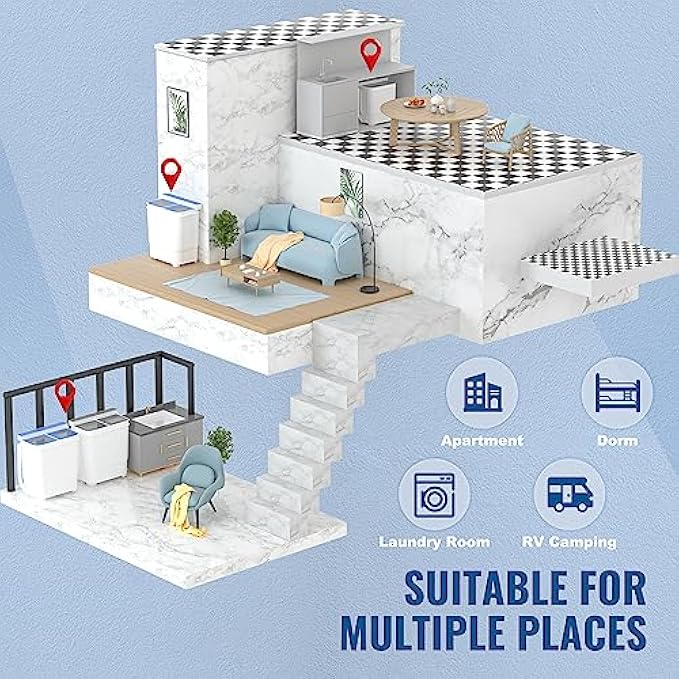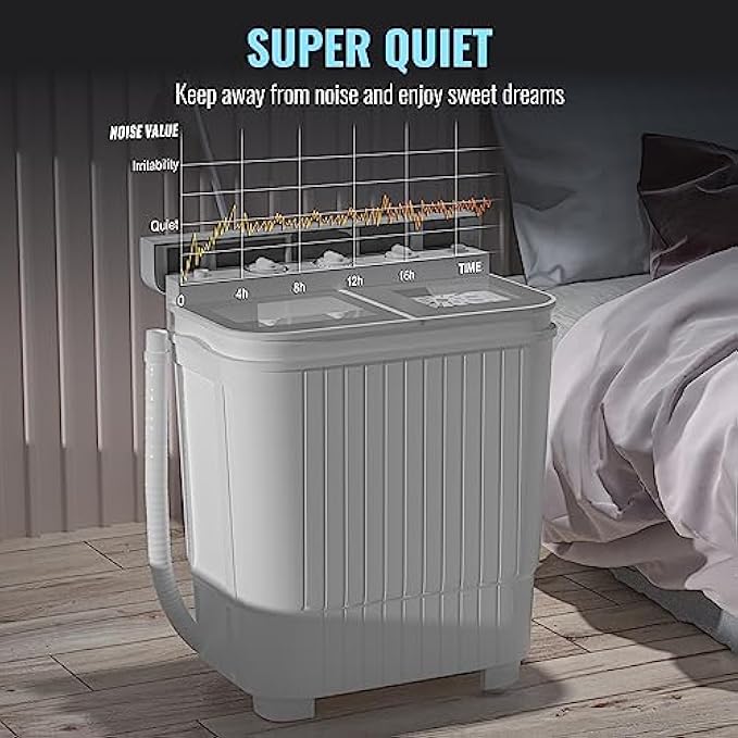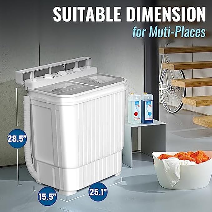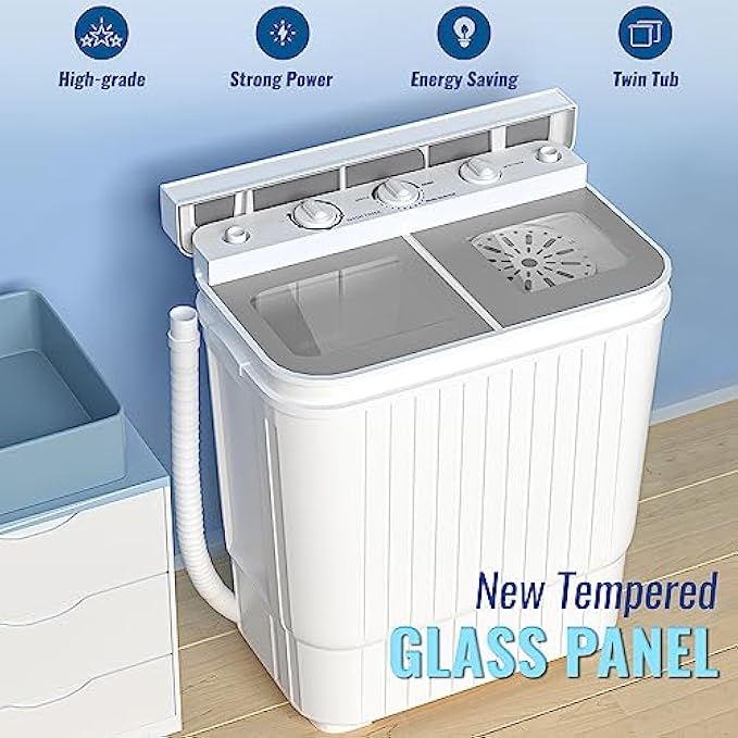 【Separate Time Control】: Our twin tub washing machine with simple operation panel is easy for you to operate, washer and dryer automatically at the same time, washer timer for 5-15 min and the spin timer to 1-5 minutes, which will relax your hand and save your precious time 【Practical Designs】: Constructed of upgrading plastic body that make the mini washer machine for long term use, with strong drain pump + powerful motor make it for long term use. Besides, exquisite appearance and space-saving design is ideal even though in limited space!!! 【Energy Saving 】: Small washing machines with low noise and will not disturb you and your family, offering you quiet rest environment. In addition, just put your dirty garments in the tub-set the time-start quick washing, less water and detergent, saving consumption 【Considerable Capacity】: Portable washer with enough capacity for you ( 12.6 lbs for washing, 9 lbs for Spin dry), perfect for washing various clothes, like shirt, socks and trousers. Note: The spin dry can not completely dry the clothes, still need to dry in the sun 【Great Service】: Semi-automatic washing machine offers you good working and satisfying shopping experience. Any problems about the washer, we will offer help and solve them asap