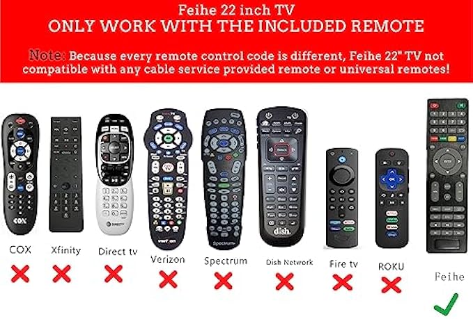 • 📺Unique Remote Control: Control your TV with one remote control with clear every button function, very easy to use.(Note: Because the remote control code is different,22 inch TV is not compatible with Xfinity/Direct tv/Comcast /Verizon remotes.Require user to have Two remote controls to operate TV.)