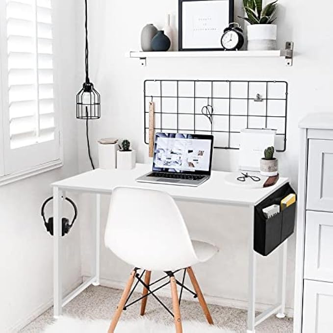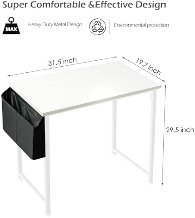 Small Computer Desks: With Storage Bag Headphone Hook, Dimension is 31.5'' L x 19.7'' W x 29.5'' ,Space saving, great for student teens boys girls writing adult work. Modern Simple Style Design: Desk is made of thick Particle board with scratch-resistant, anti-collision and waterproof, protect home office desk surface from daily wear and tear, White desktop match white metal frame ,with storage bag and Headphone hook ( Both Removable ) . Sturdy Structure: Extra fixed steel brackets and adjustable leg pads provide greater stability, ensure the desktop is level, non-slip & anti-scratch protectors under the legs to protect your floor from scratching and reducing noises when moving. Easy Assemble: A detailed instruction manual and tool are provided, no other tools required, quick and easy to assemble, about 10 minutes. After-sale Service: Provides professional customer service, easy and fast replacement is guaranteed if have quality problem of the desk, please feel free to contact us.
