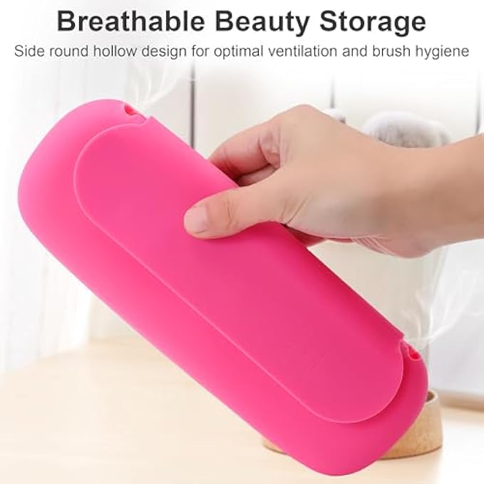 • 【2024 Newest Makeup Brush Holder】The BAGCRAZY silicon makeup brushes holder adopts a streamlined, ergonomic design with a focus on both stylish aesthetics and practicality. The top features a flip cover secured with a magnetic clasp to prevent brushes from falling out. Additionally, the side is designed with anti-slip lines for a secure grip, and breathable holes ensure your brush set stays protected without retaining moisture.