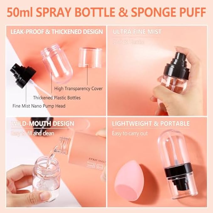 【Lock In Your Look In Anywhere】This Setting Spray Set includes 6.7 Fl oz large capacity face makeup finishing spray, translucent loose setting powder and 2PC sponge puff. For a matte makeup look that stays put, use our long lasting setting spray and setting powder to reduce shine, control oil and leave a fresh, just-applied look all day. 【Ultra Fine Mist Spray】The nozzle has a superior atomization effect, evenly covering the skin. Fast film formation, won't damage your makeup. Works with all face makeup including foundation, eyeshadow, blush and concealer, and keeps color fresh. 【Multifunctional face hydrating fixer】Moisturizing & hydrating formula refreshes your skin and sets makeup in place. It can be used before & after applying makeup as Primer, Setting Fixer & Toner. After moisturizing the brush or sponge puff with this setting spray, and then apply foundation for a longer lasting base as well as a smoother application. 【Setting Powder Makeup】This silky and weightless texture loose finishing powder is perfect for absorbing oil, setting your makeup, or wearing alone for a blurred soft-focus finish. Its translucent loose powder formula goes on neutral, allowing it to work on all skin tones and skin type. Apply after foundation, concealer and contour to set and highlight liquid makeup. 【SAFE & EFFECTIVE FOR ALL SKIN TYPES】This large size face setting spray for make is gentle, non-irritating and cruelty-free. Its non-comedogenic formula won't clog your pores. No oil and no alcohol which is making it perfect for those with oily or combination skin.