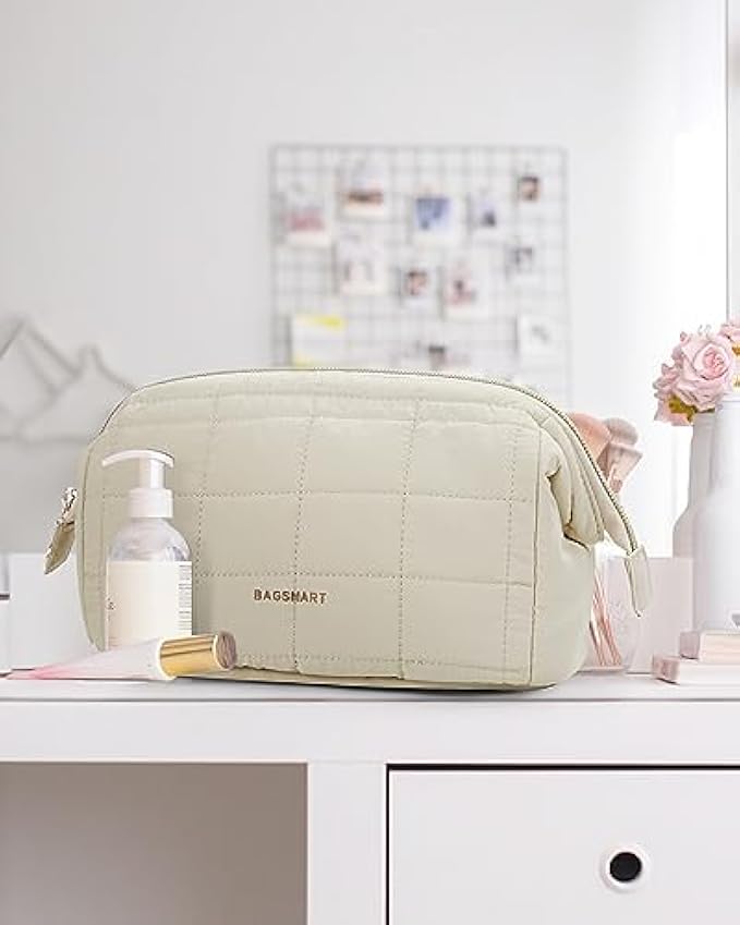 BAGSMART Makeup Bag Cosmetic Bag Wide Open, Beige, M, Wide-open Travel Makeup Bag With Puffy Padded and Rectangular Quilted