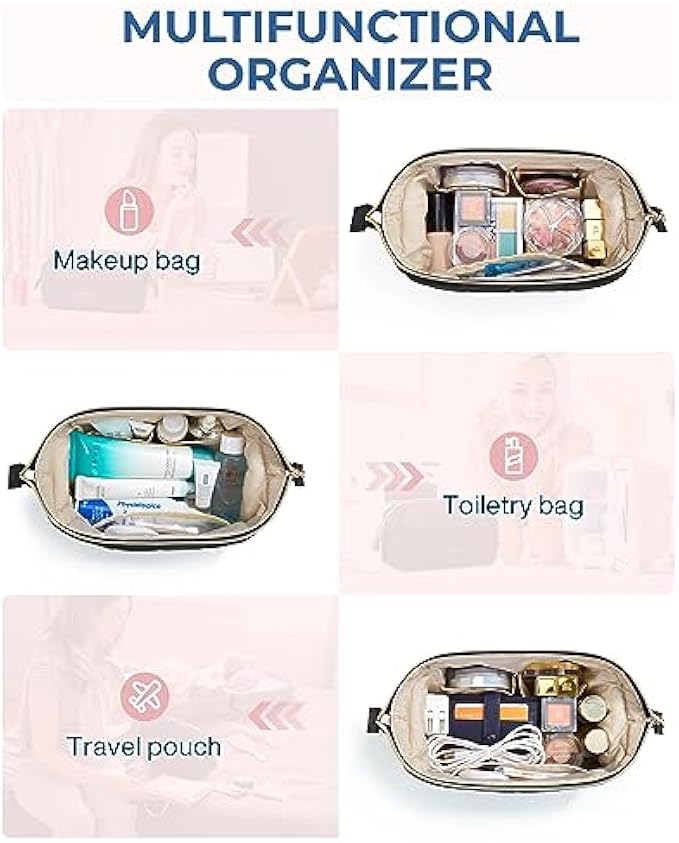 • 【CONVENIENT DESIGN】- The wide opening design of this makeup bag allows for effortless access to all your beauty essentials. Say goodbye to wasting time searching through tiny cosmetic bags. With this women's makeup bag, you can quickly find your desired cosmetics like lipstick or eyeshadow.