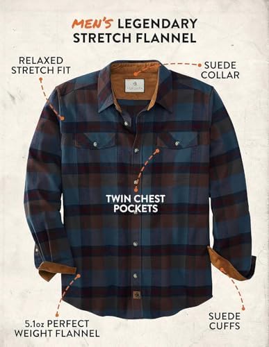 RELAXED STRETCH FIT: The Legendary Stretch Flannel Shirt is designed with the same relaxed fit as our other shirts. In addition, it has a raised back yoke, and premium stretch fabric to give you full range of motion… even at full draw! SNUGGLY SOFT: This flannel shirt features premium brushed cotton fabric with a touch of Spandex to give you ultimate comfort and flexibility. Furthermore, with the super soft suede knit lining at the collar and cuffs, you're sure to receive extra cuddles! DURABLE QUALITY: Our custom suede knit lined collar and cuffs not only look cool, but add stablility... which means they will hold their shape so you don't have to iron! UPDATED STYLE: We made this men's flannel shirt with convertible pocket flaps that tuck in for overflow storage, perfect for oversized smartphones. Or, they can be worn as traditional flap pockets, buttoned to secure your belongings. Wash:Machine wash cold separately. Do not bleach. Tumble dry low. Remove promptly. Low iron #8,321 in Clothing, Shoes & Jewelry ( ) #100 in