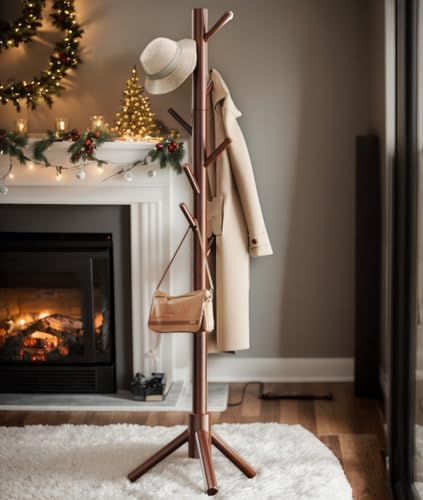 Pipishell Sturdy Wooden Coat Tree with 8 Hooks, 3 Adjustable Sizes for Clothes, Hat Stand Used in Bedroom/Office/Entryway, Brown