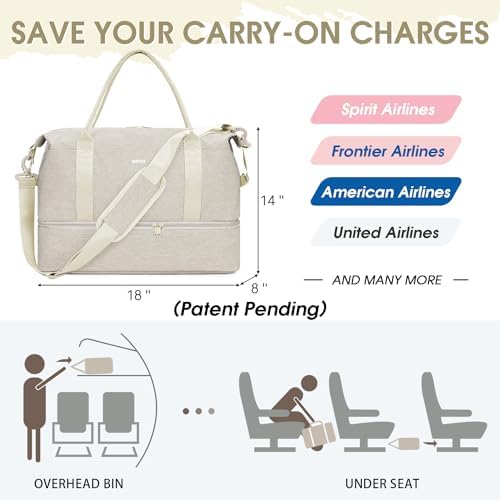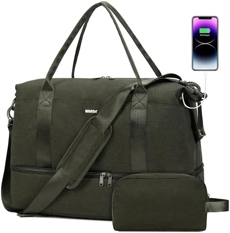 【Save Your Carry On Charges 】WANDF 18 x 14 x 8 inches travel bag that meets the personal item size requirements of Spirit and Frontier Airlines. It can be placed under seat to save your oversize charges. (Patent Pending) 【Wet Pocket & Shoe Compartment 】The interior design of WANDF overnight bag includes a wet pocket for storing damp towels, swimwear, and other wet items, effectively separating your dry and wet belongings. The bottom features a separate shoe compartment with breathable vents, accommodating various sizes of slippers, athletic shoes, high heels, leather shoes, and more. 【Travel Friendly】Our airplane travel duffel bag is designed with an external USB charging port, providing on-the-go device charging for added convenience during your journey. The trolley sleeve on the back fits various rolling suitcase sizes. Equipped with an adjustable and detachable shoulder strap with shoulder padding, providing you with versatile carrying options. 【Extra Laundry Bag & Toiletry Bag】Featuring an additional laundry bag to manage dirty clothes or towels, effectively separating clean items from the soiled ones. With a generously-sized toiletry pouch, you can effortlessly store all your travel grooming essentials. Conveniently separate clean and dirty items, ensuring orderliness during your journey. 【Multi-Function Duffel Bag】An ideal solution for toting your gym and travel essentials. This versatile dufffel bag serves as the perfect companion for airplane travel, a spacious gym sport bag, a convenient weekend bag, and a stylish beach bag. It suits various indoor and outdoor activities, including travel, sports, weekend getaways, yoga, gym sessions, beach outings, business trips, and everyday use. #14,461 in Clothing, Shoes & Jewelry ( ) #45 in
