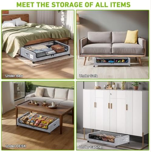 Large Capacity : Our wheeled bed storage box is made of high-quality 600D Oxford Cloth and sturdy metal frame, It is more durable than other fragile metal nets, can hold 60 pounds, and is more sturdy than other fragile metal nets. The spacious capacity is very suitable for storing clothes, playthings, books, shoes, and other heavy objects, and will not affect stability and durability. Clear Lid Design : The transparent top makes it easy to quickly identify what's inside your storage. To totally keep the dust, humidity or dirty out, the under bed rolling storage designed with closed dual zip-up lid and quality non-woven fabric, moreover your kitten and dog can no longer make a mess under your bed. With the all-in-one under bed organizer you needn't worry for finding separately dust bag. 360° Rotating Wheels: YAASHEEN Underbed container is equipped with 2 side handle and 4 smooth 360° universal wheels that glide effortlessly on various surfaces. By removing the bottom metal frame, you can easily put the storage bag on the wardrobe. Ideal storage basket for dorm room, attic, basement, and bedroom use. Make your home no longer messy: Our bed bottom storage cabinet can organize clothes, shoes, toys, and other miscellaneous items, which can be used in the living room, room, TV cabinet, making your home from messy to neat! Easy to Install: YAASHEEN rolling storage bin can be installed in 30 minutes with user-friendly instructions. Saved you time and effort. This versatile storage solution isn't limited to just underbed use, it can also be placed under cribs, couches, sofas and furniture. A must-have bedroom essential for you!