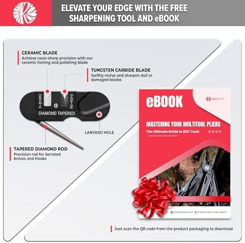 🧰 ULTIMATE UTILITY AT YOUR FINGERTIPS: Multitools Foldable Pliers 19 in 1 Stainless steel bundled with Free Sharpening tool. Compact design including Scissors, Saw, Wire Stripper, Wire Cutters, Can Opener, Bottle Opener, Screwdrivers, Awl, Metal File, Ruler, 4 in 1 Hexagon Wrench. 🦺 GEAR UP FOR SAFETY AND VERSATILITY: RODYVAN's camping multi-tool, hand tools features a larger size and enhanced functionality. The safety locking structure ensures all tools are securely locked when fully open to prevent injuries during outdoor hiking or camping activities. 🔩 STRENGTH MEETS STYLE: This multi-tool exemplifies a perfect blend of resilience and sophistication. Constructed with the robust 440A stainless steel, it not only ensures sturdiness but also guarantees durability and rust resistance, making it a reliable companion for various Outdoor Activities 🌄 ELEVATE YOUR EDGE: Introducing our 4-in-1 multi-purpose outdoor sharpener, featuring precision-crafted tungsten steel for unparalleled durability. This compact and portable tool ensures sharp edges with a fixed-angle design, making it a must-have for outdoor enthusiasts. ✅ ITEMS DELIVERED: 1 RODYVAN Multitool foldable pliers, 1 Sharpener, 1 eBook (downloadable), 1 Nylon Pouch and 12-in-1 Screwdriver Bit Set. YG12 replaceable Wire cutter, Screws and Allen key.