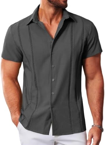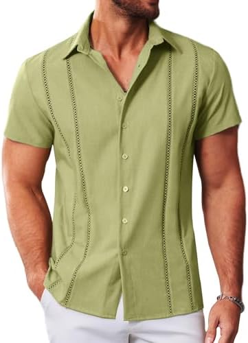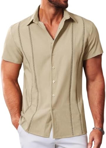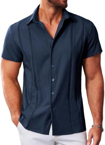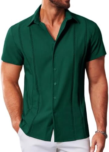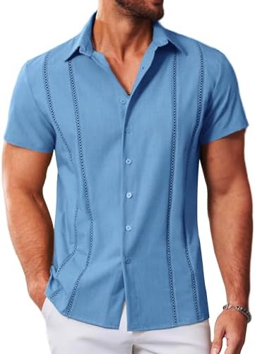 【Soft Material】This men's Guayabera shirt is crafted from comfortable Rayon&Spandex. Breathable, soft, and skin-friendly, it ensures you stay cool and comfortable even in the hottest summer weather. 【Features】Men's cuban guayabera summer shirt features a Cuban collar for added neck space, ensuring cool comfort. Short sleeves, button-down closure, cutout embroidery, and a straight hem create a relaxed, stylish look. 【Easy Match】Men's casual button-down shirts. Embrace the laid-back vibes of summer with our men's beach casual shirt, effortlessly paired with shorts, jeans, trousers, jackets, or even suits. 【Ocassion】Unleash your summer style with our men's Cuban trendy shirts, perfect for beach, tropical getaways, outdoor, casual, weddings, cruises, or simply soaking up the sun with friends. 【Care Instructions】 Wash with cold water either by hand or machine, low-temperature drying. Please carefully review our size chart before making a purchase. #45,369 in Clothing, Shoes & Jewelry ( ) #515 in