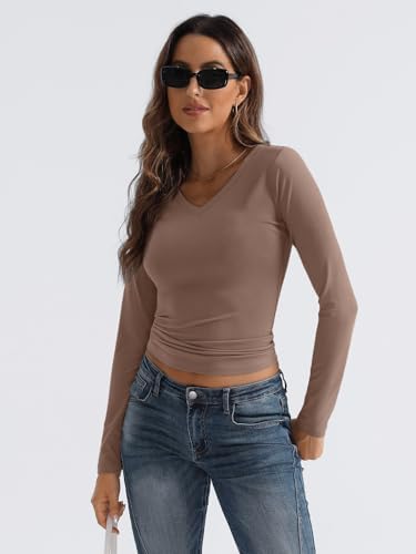 Trendy Queen Long Sleeve Shirts for Women 2024 Fall Fashion V Neck Basics Crop Tops Layering Slim Fitted Y2K Tops