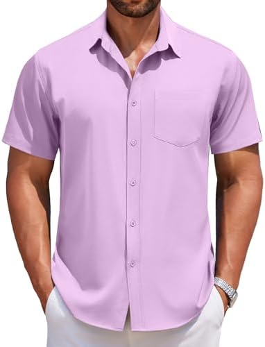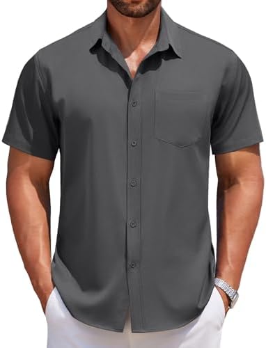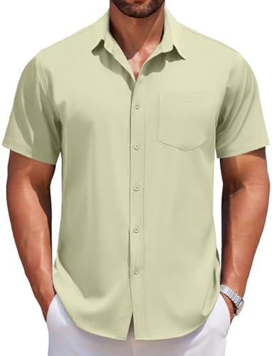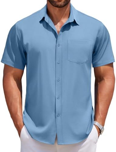 WRINKLE-FREE FABRIC:COOFANDY men's casual short sleeve button down shirts are crafted from a wrinkle free, lightweight, breathable, soft, skin friendly, Moisture wicking fabric, slightly stretch, silky feel; this summer untucked wrinkle-free shirt keeps you cool and comfortable in any weather MODERN LOOK:Men's button up lightweight dress shirt features regular fit, turn down collar, short sleeve, button down closure, chest pocket, solid color; Our casual summer beach shirt strikes the perfect balance between classic and contemporary, keeping you comfortable and fresh all day long, perfect for summer or travel EFFORTLESS PAIRING: COOFANDY summer short sleeve button down shirts' modern fit and classic colors make it a versatile piece that complements both casual and formal attire with ease; Whether paired with chinos or jeans for casual wear or dressed up with formal pants for special occasions MULTIPLE OCCASIONS: This men's short sleeve button up wrinkle free shirt is perfect for a wide range of events; Whether you're attending a wedding, going on a date, participating in a business meeting, or enjoying everyday casual wear, this shirt seamlessly adapts to any setting WARM TIPS: Machine washable, no fading, shrinking, or wrinkling. Please refer to our size chart carefully before purchasing casual summer untucked wrinkle free dress shirts #127,351 in Clothing, Shoes & Jewelry ( ) #1,189 in