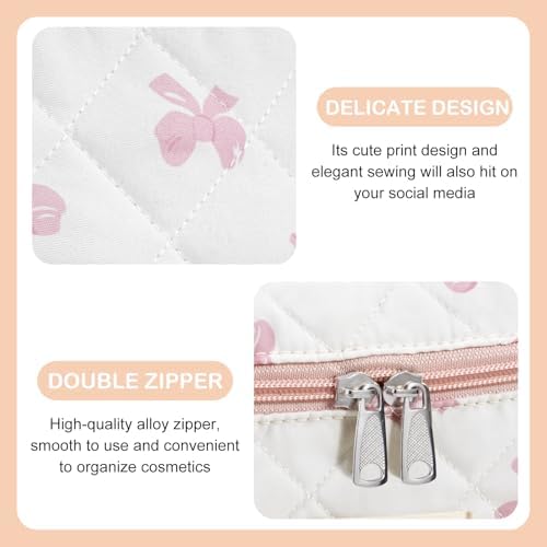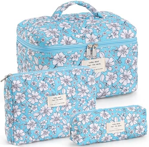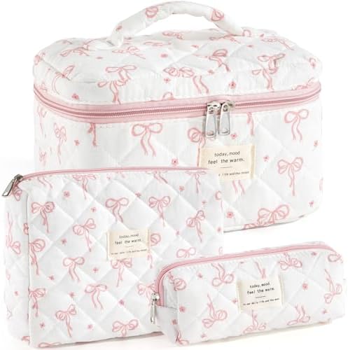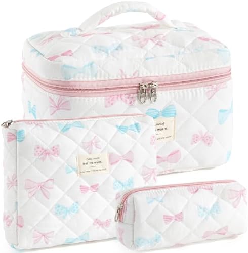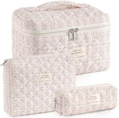 UYUUY Makeup Bag for Women 3PCS Quilted Cotton Make Up Bag Travel Cosmetic Bag Large Makeup Bag Set Cute Bow Makeup Bag Organizer Floral Toiletry Bag Makeup Pouch for Purse