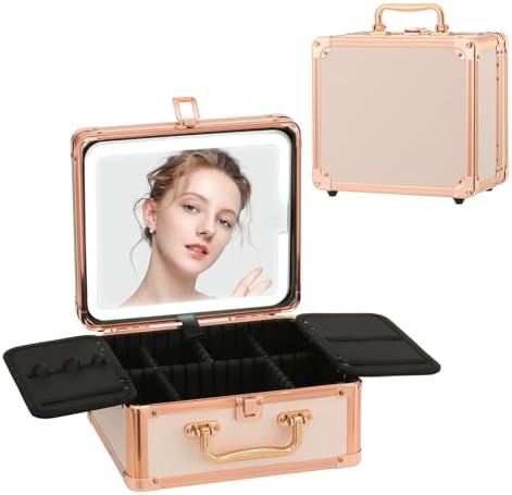Leeora&Leekoo Makeup Box with A Detachable Lighted Mirror, Waterproof Travel Train Case, Cosmetic Organizer and Makeup Suitcase with Adjustable Dividers, LED Mirror (Black, Plane)