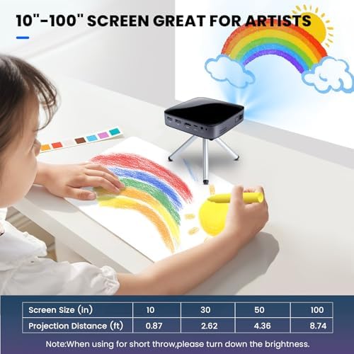 【Extra Andriod 11 System】Contact Amazon Futuzen shop customer service to get extra andriod 11 system, you can access millions of videos without using an additional TV stick, including content from YouTube, NetfIix, Prime Video and other apps. 【Rechargeable Mini Projector】 This mini portable projector built in 8000 mAh batteries, which can play for up to 3 hours, you can enjoy a whole movie freely even you're in camping, travelling, road trips! Thanks for the mini size( 4.7*4.7*1.1inch) and super light weight design(0.88lb), you can easily fit the portable projector into a pocket. And we also offer you an extra 135°rotatable tripod, allowing you to effortlessly project from any angle, even on ceilings. Convenient and perfect for cozy binge watching ! 【Mini Projector With Wifi And Bluetooth】: Say goodbye to the traditional HDMI cable conversion projection, Futuzen mini WiFi projector works with 2.4G & 5G WiFi, faster transmission rate and lower transmission delay, easily and quickly connect to smartphones, laptops, etc. within 5 seconds. Enables fast and stable projection for videos, games and more. It has has built-in Bluetooth 5.2 chip and speakers. You can enhance the sound by pairing the pocket projector with headphones, speakers or other audio devices via Bluetooth technology, or you can enjoy a comfortable audio-visual experience directly through the projector's speakers. 4 sound mode for optional. 【Upgraded Art Projector】: This small projector is specially designed for artists and cookie bakers to make your artistic process smoother and more intuitive. We've added 4 brightness modes to suit different professional needs (Standard/Cinema/Vivid/Custom). 2 aspect ratios adapt to more image sizes (16:9/4:3). 50%-100% zoom and 10"-100" screen size to help you get the right image in every situation. The auto keystone correction function helps to keep the image always straight and clear, so you never have to worry about oddly shaped images. (Please reduce brightness for short distance use) 【Better Viewing Experience With DLP Tech】: Futuzen mini projector for iphone with DLP chip supports 1080P resolution video, which provides better light efficiency and color control with bright 150 ANSI lumen images. Enjoy a brighter and clearer image than LCD projectors. And the DLP phone projector lens adopts fully sealed optical core technology,which is more dustproof, effectively reducing screen black spots, image quality loss and Longer lifespan. 【Multiple Methods For Viewing】: This wifi projector comes with 1 HDMI cable, 1 tripod, 1 adapter and 1 remote control, have 2*USB port, 1*type c port (lightning cable for data conversion, normal cable for charging), 1*3.5mm headphone jack, making it compatible with mouse, TV stick, laptop, smartphone, Android device, iPhone, iPad, USB drive, camera, Switch/PS5, etc., We have 2 after-sales service stations in USA, we value your feedback and are always here to help, and offers 2-year money-back guarantee, 3-year repair warranty, and lifetime technical assistance.