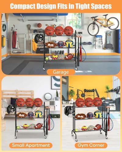 Sports Equipment Organizer Storage, Garage Ball Storage Basketball Rack Ball Rack Small Outdoor Rolling Cart with Wheels, 3-Layer Ball Holder with Two Basket for Basketballs Footballs Volleyball