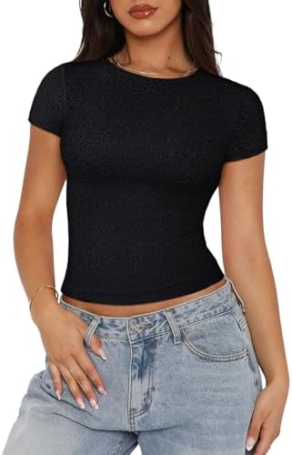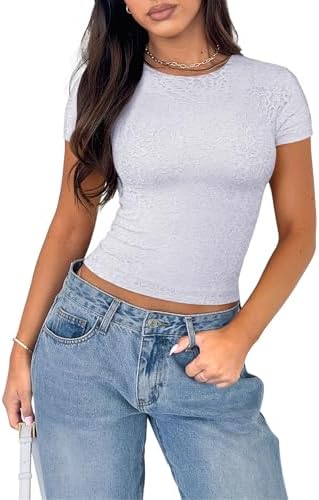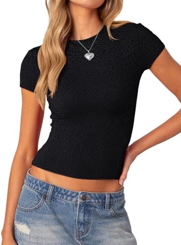 ♥Design:This round neck short sleeve top features unique design,the outer layer features sheer lace with luxurious rose patterns textured, adding layered and an elevated sense of elegance and sensuality.the floral details enhance a woman's charm and sophistication. ♥Feature:This women's crew neck top with the outer layer made is delicate lace for aesthetic appeal, while the lining ensures comfort, breathability, and a smooth, lightweight feel. The high quality inner layer feels soft to the touch, offering full coverage while maintaining the elegance of the lace. ♥Fabric:Womens summer tops from an incredibly soft, skin-friendly fabric, provide a luxurious second-skin feel. double lined ery supportive no need to wear a bra with it. The slim-fit cut perfectly contours your curves, accentuating the waist and chest, with a length that falls just below the navel for all-day wear. ♥Size:XS--bust--28.74,S--bust--30.71,M--bust--32.68,L--bust--35.04,XL--bust--37.8.The slim crop top great stretch offers effortless flexibility, allowing you to move freely while maintaining a flattering fit or without feeling restrictive. ♥Versatile:The lace going out tops suitable for daily wear, streetwear, going out, dating, party, club concert, holiday, valentines; easily pairing with jeans, shorts, skirts, or cargo pants for a casual Y2K look, and transitioning seamlessly from casual outings to more formal events, offering both comfort and sophistication. #1,388,163 in Clothing, Shoes & Jewelry ( ) #34,214 in