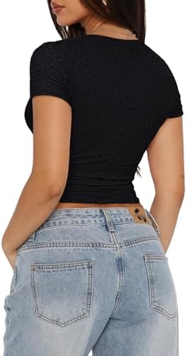 PINKMSTYLE Womens Crew Neck Lace Short Sleeve Tops Slim Double Lined Going Out Y2K Trendy Cropped Tops Summer Shirts 2025